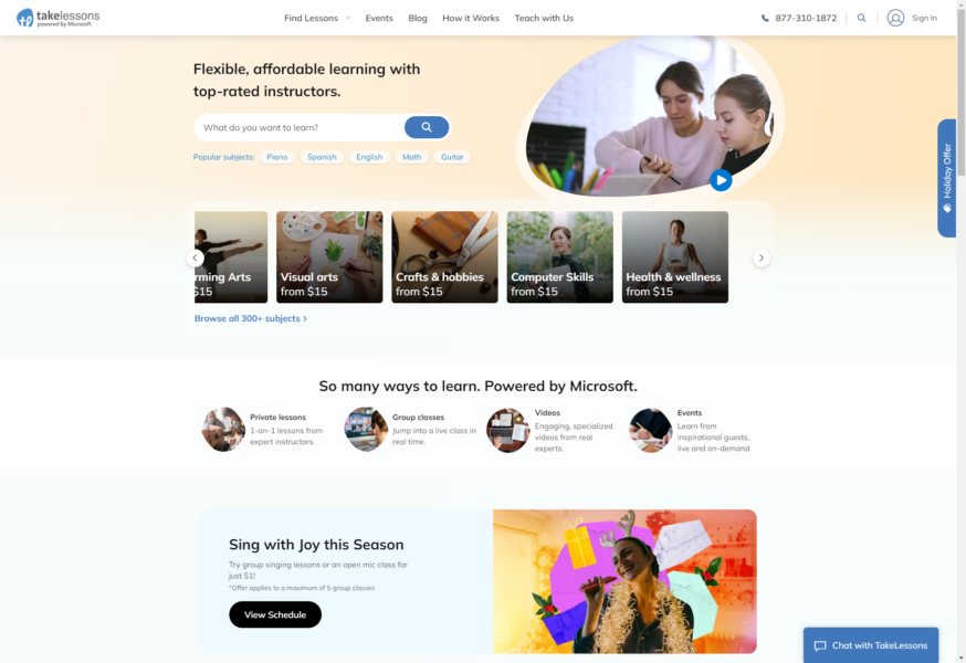 TakeLessons makes learning anything easy, cost-effective and successful for anyone of any age. Start getting lessons tailored to your individual needs with an experienced teacher today. With flexible scheduling options, you can fit a lesson into even the busiest of schedules. TakeLessons provides a wide range of instructors and classes.