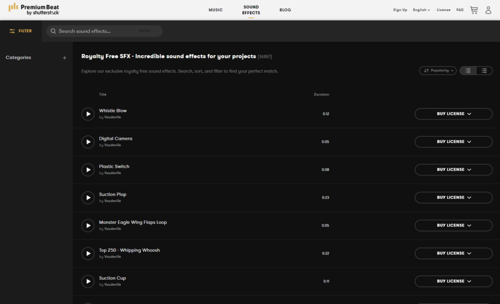 Premium Beat is another great source for royalty free sound effects. Their library offers a diverse selection of sounds, from sci-fi atmospheres to organic Foley and more. They also offer flexible licensing agreements and have detailed search categories so you can quickly find the sound you’re looking for.